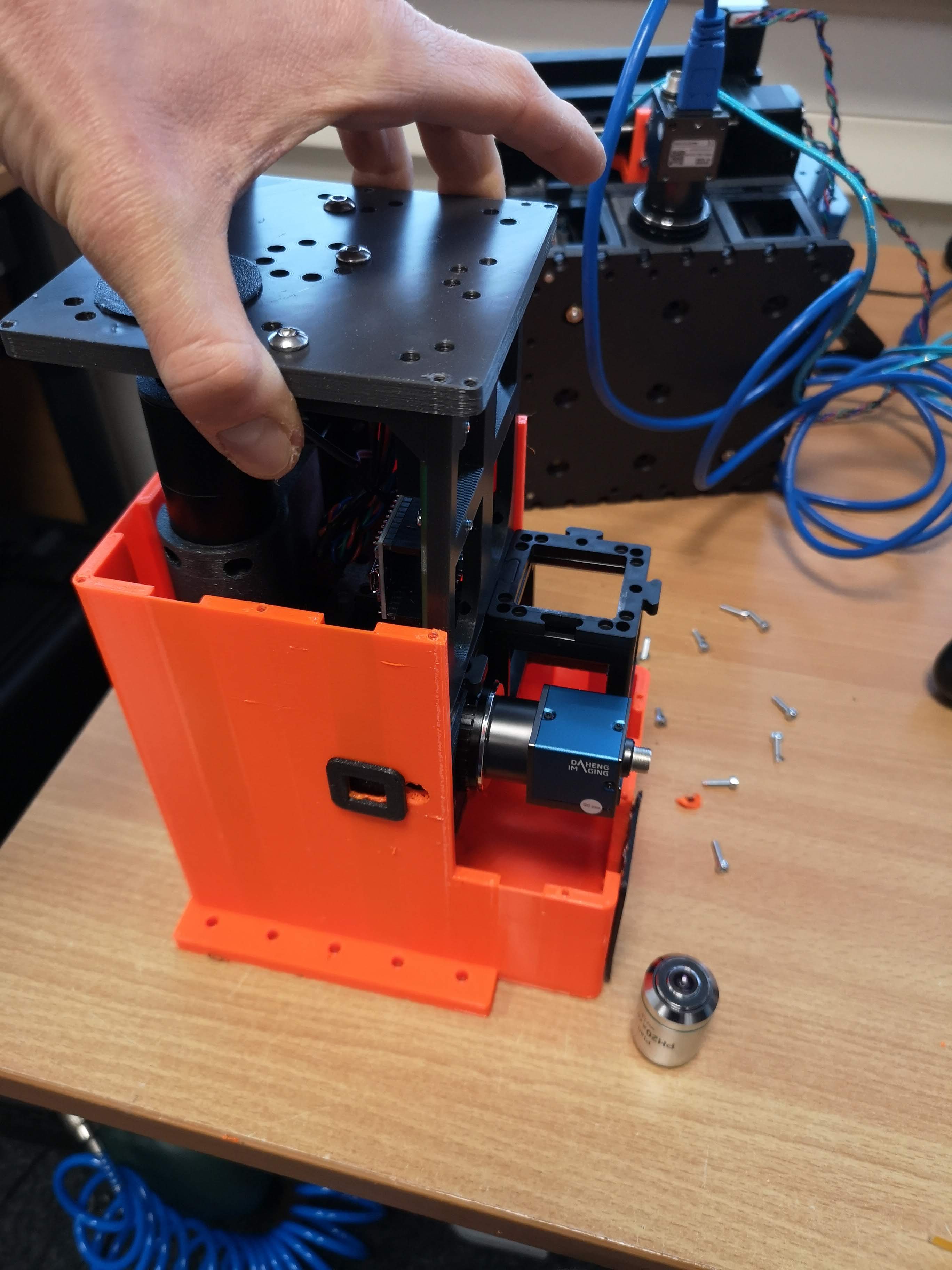 We learn from mistakes. So lets start learning. The system is fully open, meaning, you can adjust and change the vast majority of the parts on your own. The entire system consists of the openUC2 frame / skeleton and the 3D printed housing to shield it from dust and light. By removing all M3 cylindrical screws, you can detech the housing from the inner structure to eventually repair or alter the system.