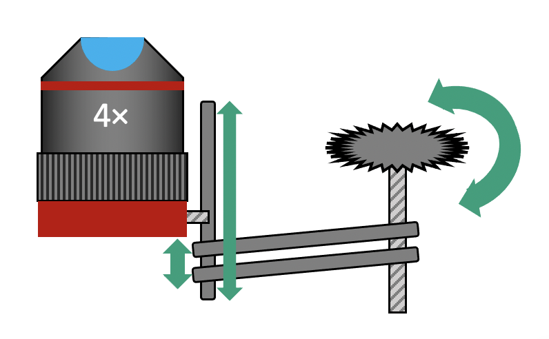 Los microscopios pueden enfocar el objeto moviendo el objeto o la lente. Aquí movemos la lente mediante un mecanismo simple. La rotación del engranaje se traduce en un desplazamiento del objetivo. Para movimientos mayores, también puedes mover la lente sobre el riel.