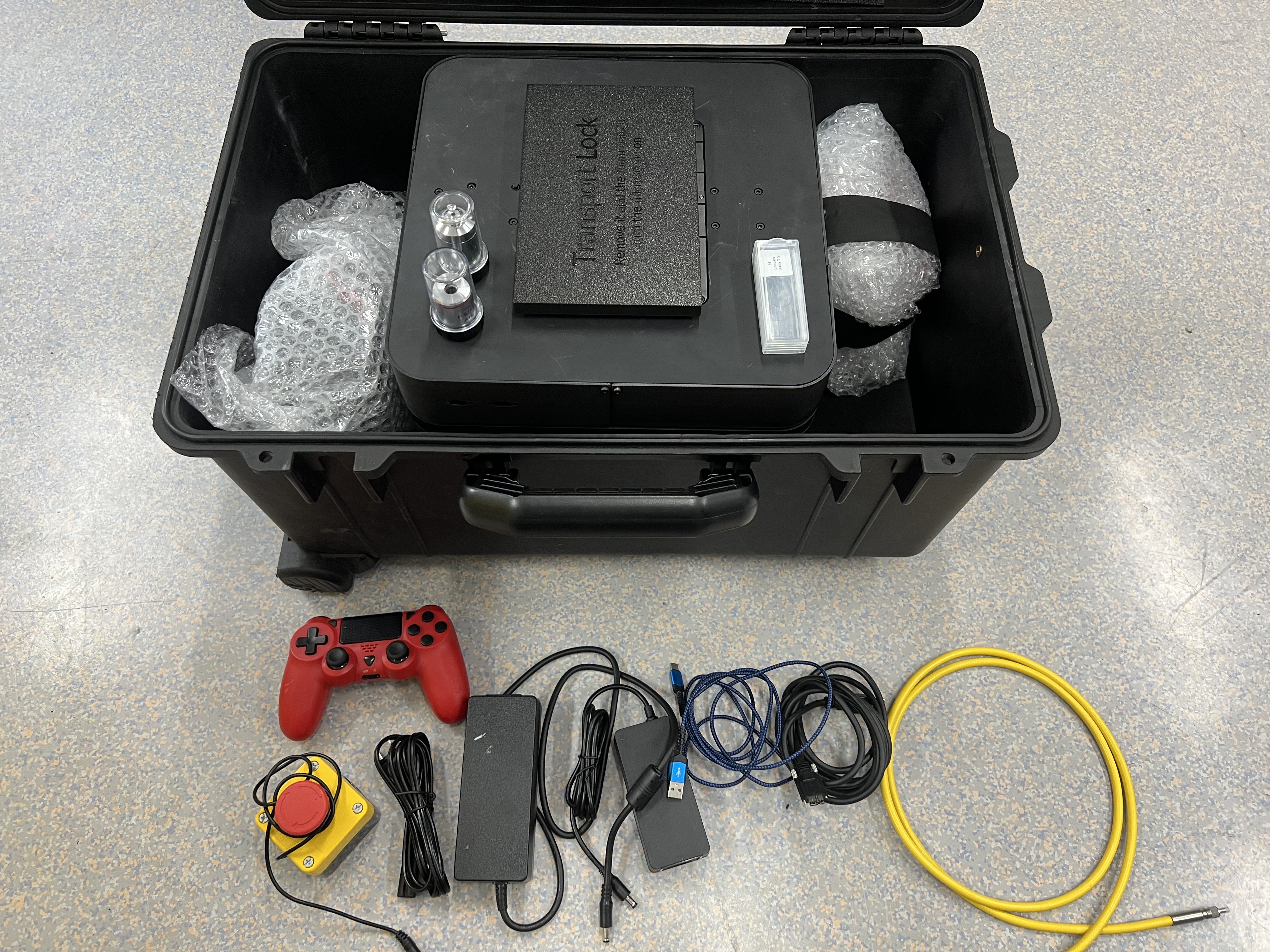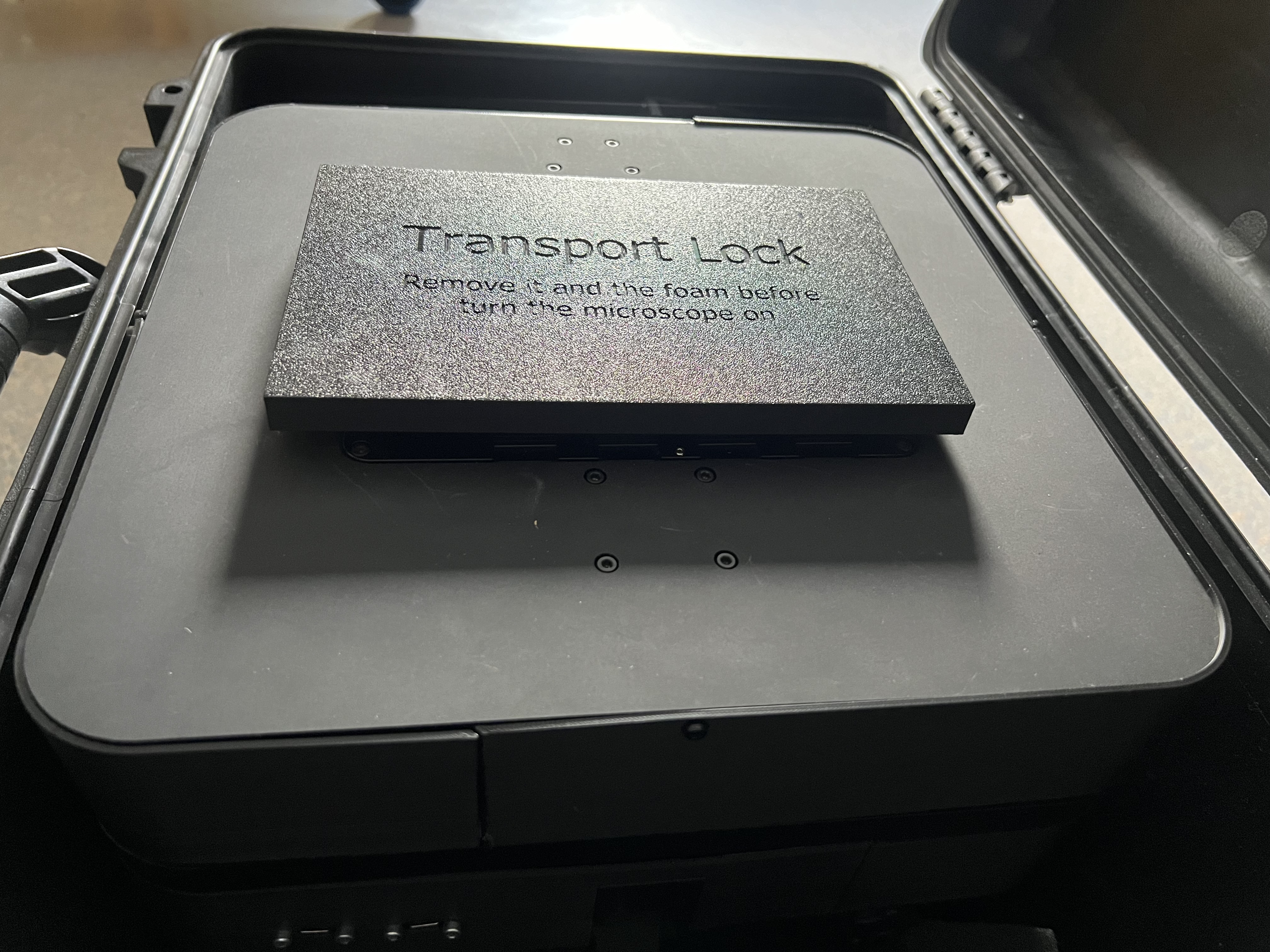 The FRAME is covered with packaging material, foam and bubble foil, unwrap the parts and take out the components, starting with the smaller parts, including the illumination arm. The FRAME body itself is very heavy, so please make sure you get additional support and move the box out of the suitcase carefully. Hold it from the lower end don't lift it holding the Z-stage!, put this on a surface that is decently stable!