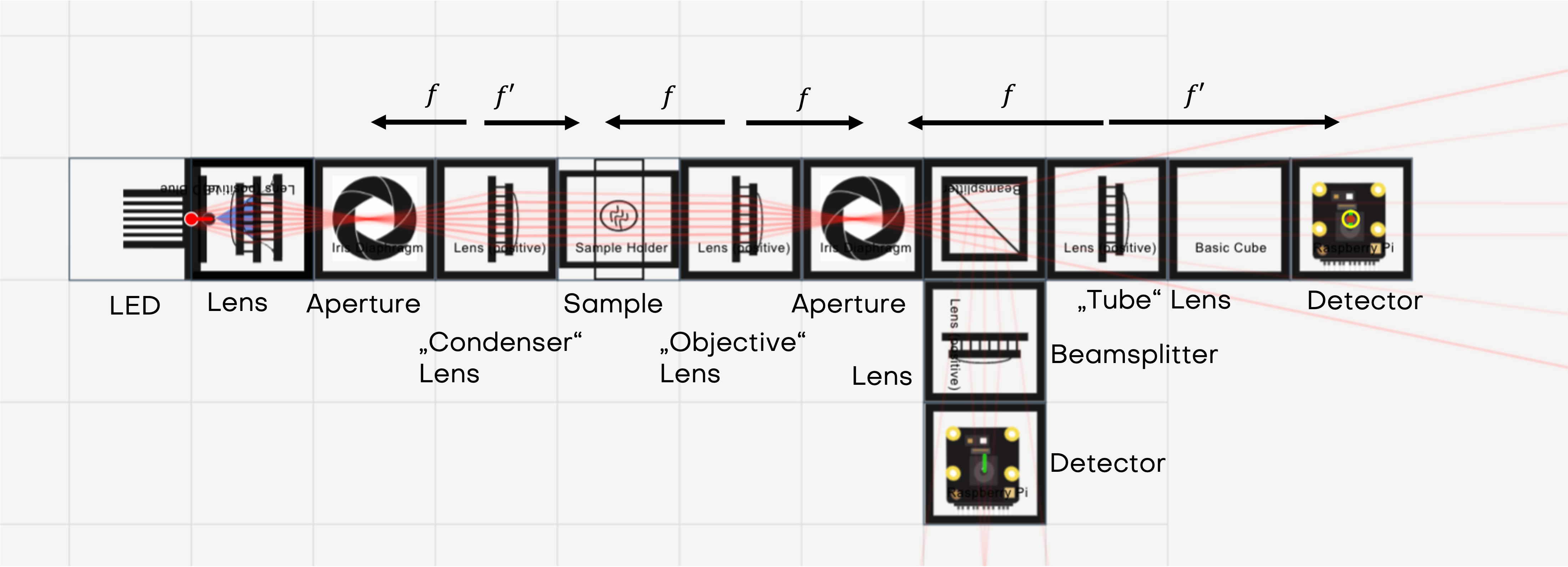 - Tube lens cube: plano-convex (f=100,\text{mm})