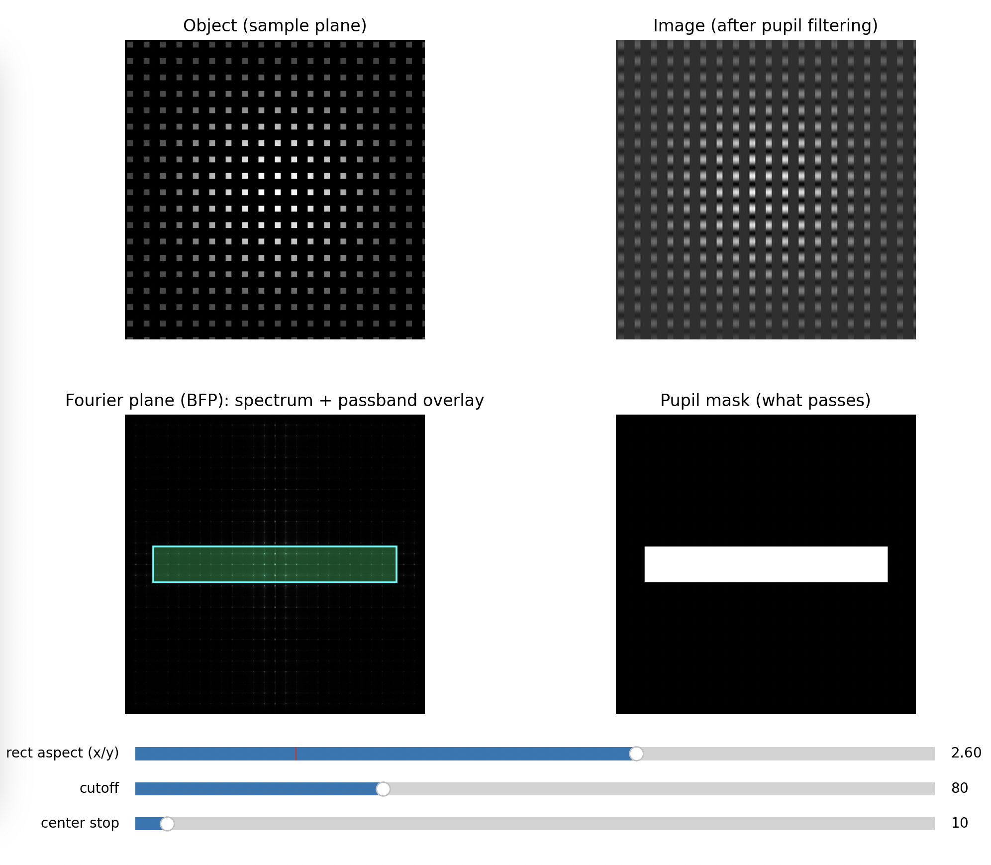 So the BFP literally displays the object’s spatial frequency content as spots or peaks. Your BFP aperture is a physical low-pass (or directional) filter in spatial frequency space.