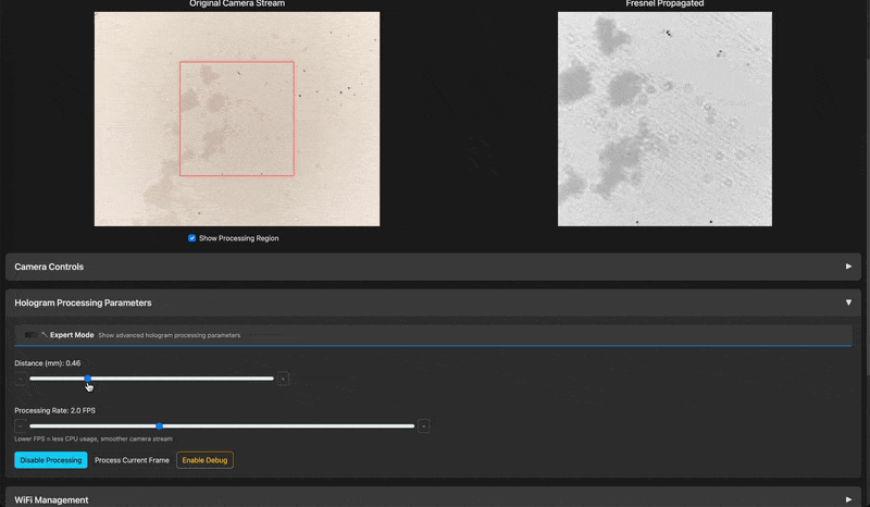 Connect the Raspberry Pi Camera (optional) Start capturing digital holograms or real-time interference patterns. Connect to the Wifi Hotspot (password: